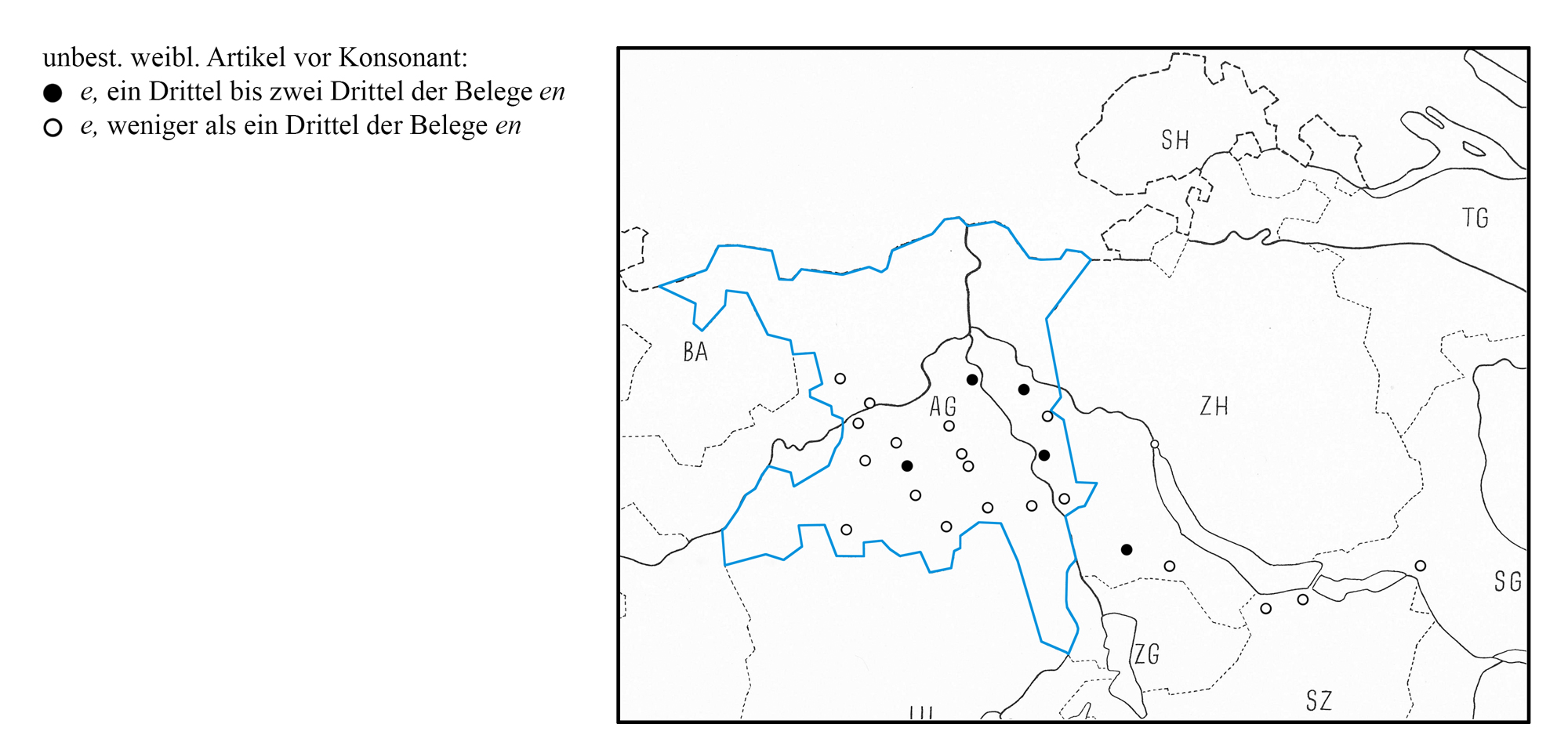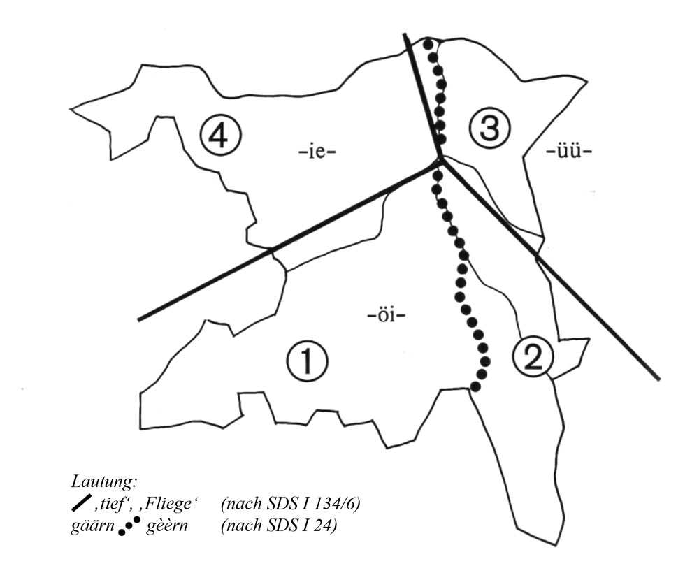 Um die Herkunft eines Aargauers aufgrund seiner Sprache zu bestimmen, genügt folgendes Schibboleth: Man frage ihn, ob er gern Fliegen habe. Nehmen wir einfachheitshalber an, dass die Antwort immer positiv ausfalle, so ergeben sich vier als lautliche Varianten unterscheidbare Antworten; diesen vier Varianten lassen sich die vier Gebiete ziemlich genau zuteilen: