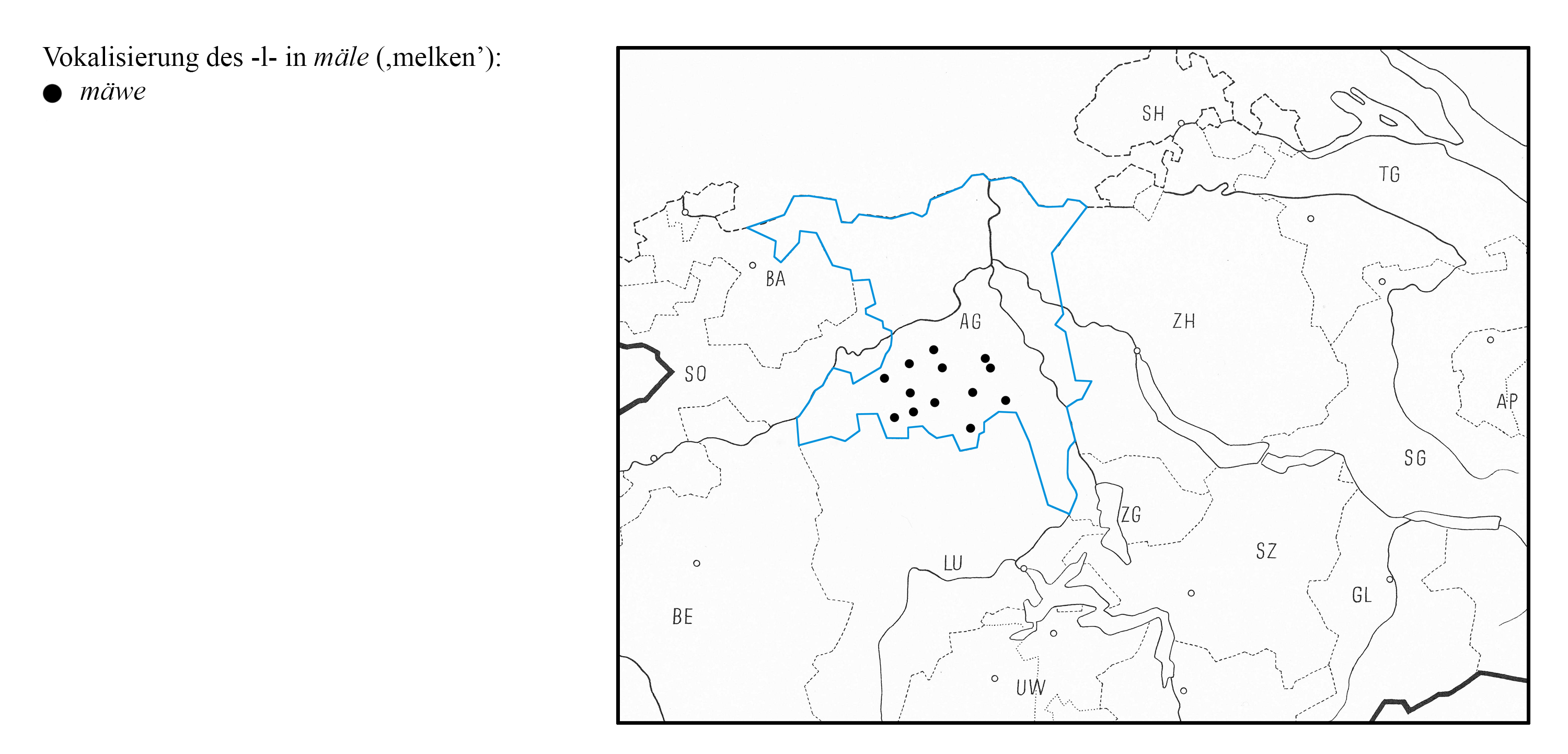 Traditionell konnte man die vier Hauptmundarten auch wortgeographisch abgrenzen, etwa anhand der Karte V212 des Sprachatlas der deutschen Schweiz (SDS): Das Bonbon hiess im Berner Aargau Täfeli, im Freiamt Zückerli, im Nordosten Zältli und im Nordwesten Chröömli oder Guuts(l)i . Diese sprachlichen Grenzen haben sich aber in der heutigen Zeit verschoben (vgl. die beiden Karten und den Text im Kleinen Sprachatlas der deutschen Schweiz). Solche dialektologische Aufspaltung beschränkt sich nicht auf das Kantonsgebiet, sondern bildet in vielen Fällen – etwa bei der Lautung von ,Fliege’ (entsprechend verhalten sich auch ,Griebe’, ,tief’) – die Keimzelle gesamtschweizerdeutscher Sprachgegensätze.